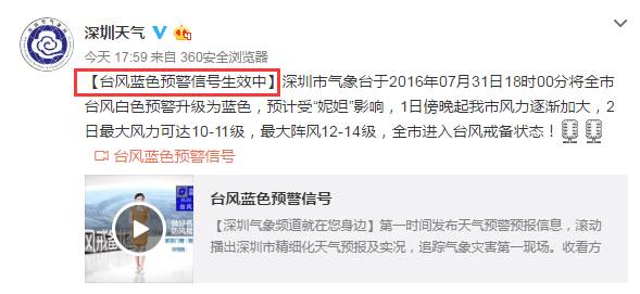 据气象部门预报,今年第4号台风“妮妲”于昨日8时加强为强热带风暴,将在2日凌晨到中午,以强台风级别在江门到惠州沿海地区登陆,与深圳最近距离在100公里以内,将正面袭击深圳,对深圳有严重风雨影响。