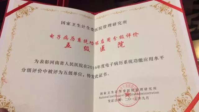 近日,2017中华医院信息网络大会暨中国卫生信息学会健康医疗大数据医疗质量管理与监督专业委员会成立大会发布了2016年度最新电子病历高级别医院名单。 河南省人民医院荣获、中国医院协会信息管理专业委员会授予的“电子病历系统功能应用分级评价五级医院”称号,2016年度河南仅此一家。