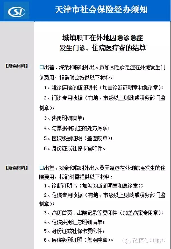 记者从社保部门了解到,城镇职工医保参保人员因出差、探亲、临时外出在异地急诊就医的,其医疗费用按照《天津市城镇职工基本医疗保险门(急)诊大额医疗费补助办法》执行,报销时应提供本人身份证或社保卡复印件、在当地县级以上医疗机构就医的当地省级财政局监制的统一有效票据,以及其余需提供的材料,比如当地开具的医院级别证明。