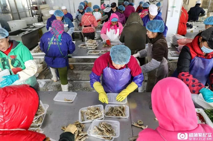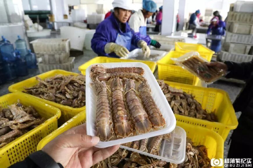 女工端起封装好的生腌虾爬子说,这段时间大家都是通宵达旦地作业,虽然辛苦些,但是挣得也多,所以很开心。