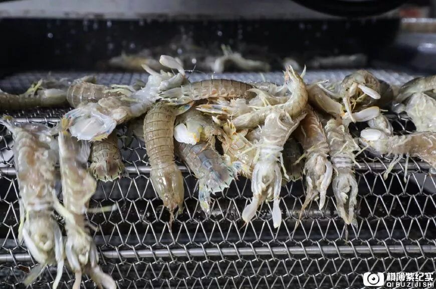 这样的传输装置会将不完整的残渣余孽过滤掉,完整的虾爬子才能进入分拣包装流程。