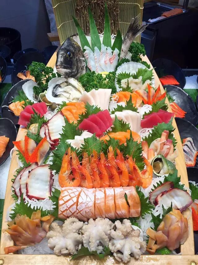 三文鱼、红金枪、白金枪,兰花蚌、章鱼足等各类刺身