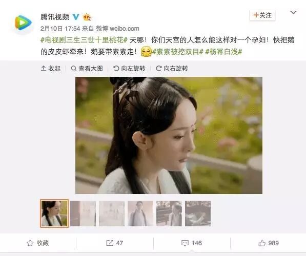 此类营销方案配图并没有常见的皮皮虾表情包,而是与自身产品相关的图片,采用该营销方式的微博大部分是自身的话题本来就火得不行,皮皮虾的加入让其跟用户的互动大大增强,更是火得一塌糊涂。其中,电视剧《三生三世十里桃花》文案中使用了剧情融入皮皮虾的方式,使得话题性原本就强大的剧集得到进一步推广,以16%的词频占有量进入与皮皮虾相关用户的热门话题词频前10名。