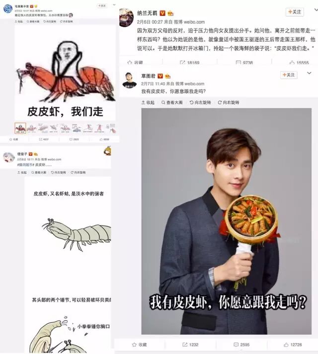 皮皮虾几乎每日都被消费,皮皮虾作为2017年第一个火起来的表情包,网民已化身皮皮虾骑士在微博上暴走,各大蓝V微博不可能错过这一个受关注度极高的话题,利用皮皮虾作为话题营销战场的武器攻城掠寨,来看看有哪几种皮皮虾营销利器吧: