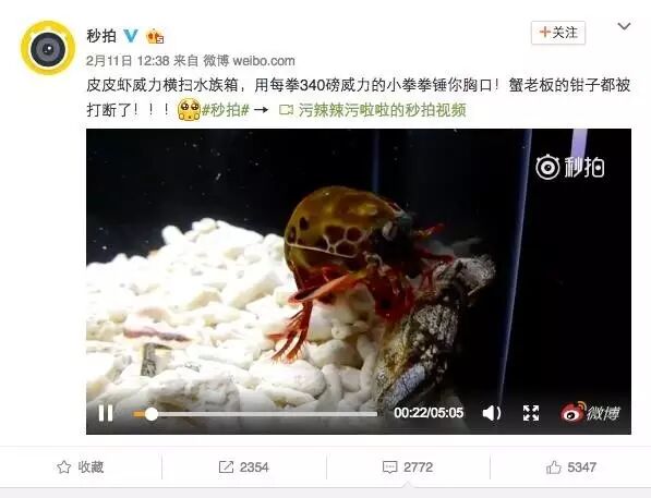 视频app、视频网站成为最大赢家,秒拍的“皮皮虾暴打蟹老板”视频互动量高达10473,借皮皮虾大热之势,秒拍的视频赚取了一大波点击量。热门表情包会衍生出很多版本或话题,从关注皮皮虾表情包发展到关注现实生活的皮皮虾中是一种垂直化的发展,秒拍这段有关皮皮虾的实拍视频就为用户呈现了皮皮虾真实的一面,从而引发了群众对皮皮虾力量的膜拜。除去秒拍外,哔哩哔哩出品的“三分钟学会椒盐皮皮虾”作为同类型的赚取点击量的视频也有2551的互动量。