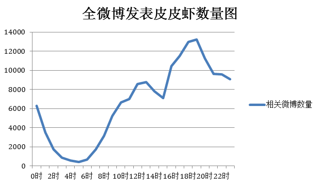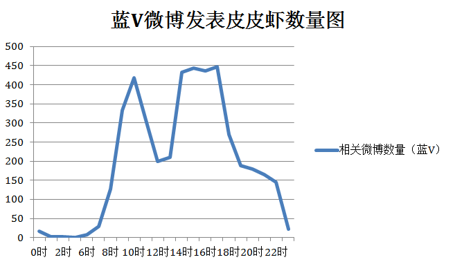 从分时图上看,蓝V微博发表相关皮皮虾的话题的高峰期是早上10点和下午2点到5点,而全微博发表相关皮皮虾的话题的高峰期是下午四点到晚上7点。