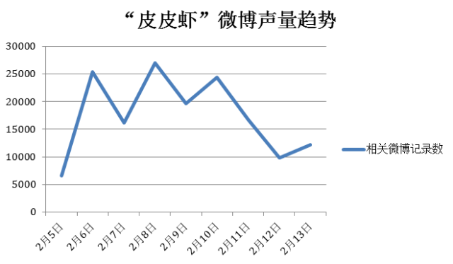 皮皮虾出现在12月底,在沉寂了近一个月后,皮皮虾的关注量在2月5日开始直线攀升,1日之间,实现282%声量增长,互动量更是攀升至39万;半月总声量近13万,互动量超过223万。