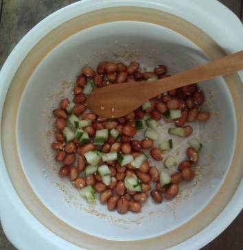 把老陈醋和黄瓜丁倒进放凉的花生米中,搅拌均匀即可。