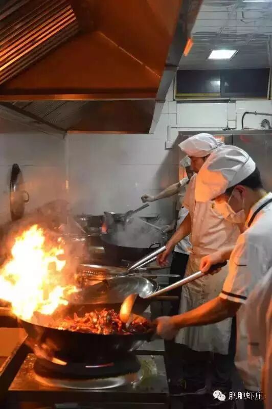 灯光明亮的肥肥虾庄厨房里,有大厨动作熟练地翻炒,旁边还有各式各样的调料,精心秘制的调料被厨师挥洒在锅里,掀起一阵香味浓郁的热气。热气四散,这样烟雾袅袅的热意,很轻易地就会唤起食欲。