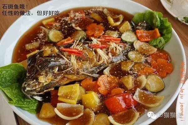 然后是这一盘子看起来五彩斑斓的红烧鱼?我也真是佩服济州的海产资源有够丰富!知道咩,这货是石斑鱼哦!我好像吃的次数有限,但这样鲜美的鱼肉而且价格不低,都是清蒸的更多一些!感受它无敌美嫩的肉肉!但是任性的红烧做法,里边有红色的辣椒,胡萝卜,洋葱,还有菠萝!然后竟然意外的让这道任性的红烧石斑鱼味道好的惊人~我们最后连这里的配菜+汁都喝光了,真的有失姑娘风采,哈哈哈哈~