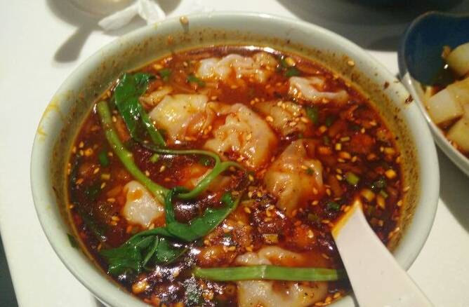 红油馄饨:既然是四川小吃,那么馄饨的做法也就不一样了,满满的一碗红油馄饨,虽然没有了清淡的味道,但是却覆上了浓浓的香辣感,绝对令你胃口大开。