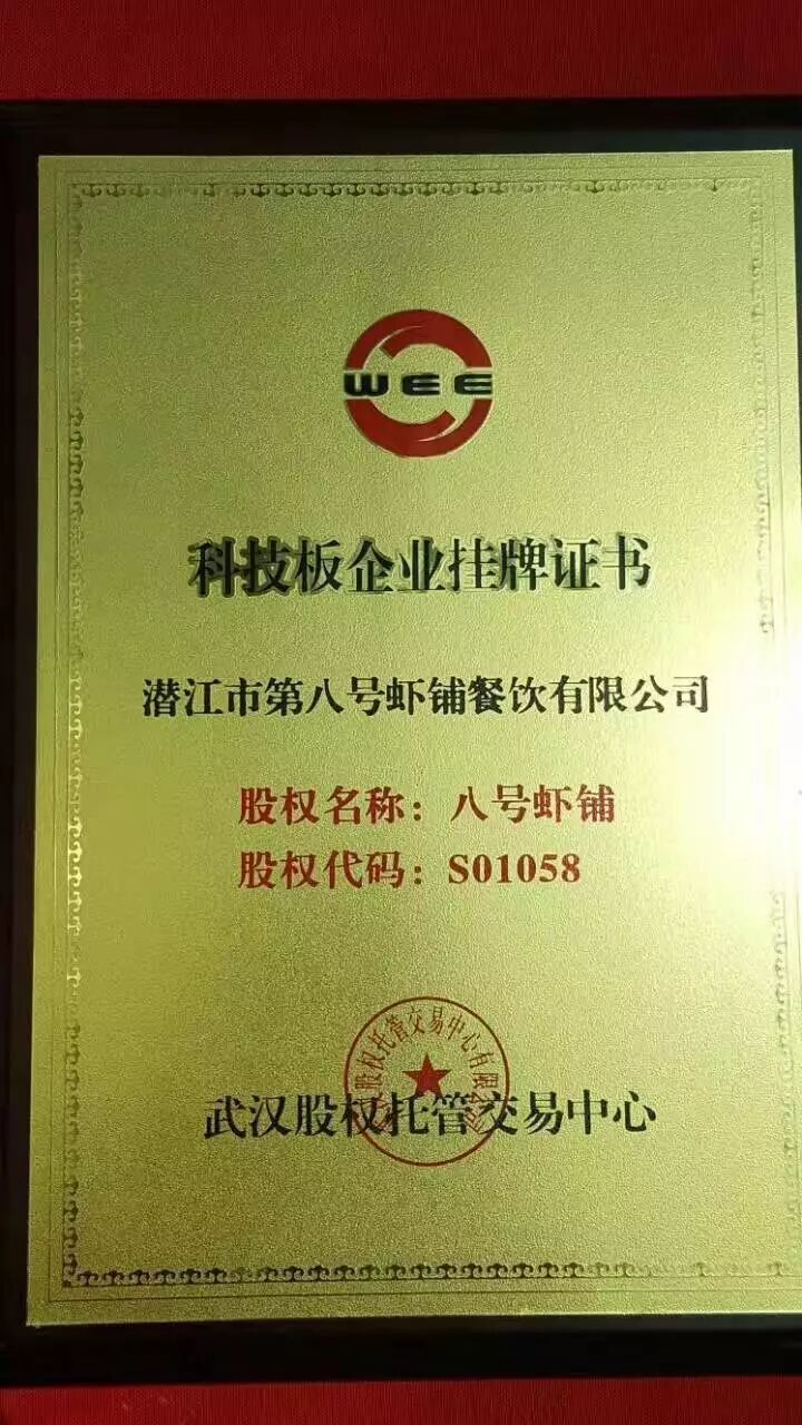 本公司是潜江市餐饮龙头企业。旗下直营店、合作店、加盟店近200家辐射全国,。潜江店每年可销售600万余只小龙虾,目前有熟食开发、餐饮培训、餐饮直营、餐饮加盟、小龙虾养殖五大核心业务,呈集团化发展之势。公司现拥有市场部、运营管理中心、底料厂、配送中心等八大部门,配套完善的支持保障体系及一支高素质的管理团队,率先导入了4D现场安全管理系统,并建立了独立完整的连锁经营体系。目前公司已建起三千亩稻虾连作养殖基地,一万平的新底料厂正在投入装修和设备调式,此次挂牌标志着第八号虾铺又上了一个新台阶!为公司布局全国,创国内小龙虾社区店领导品牌插上了腾飞的翅膀⋯⋯