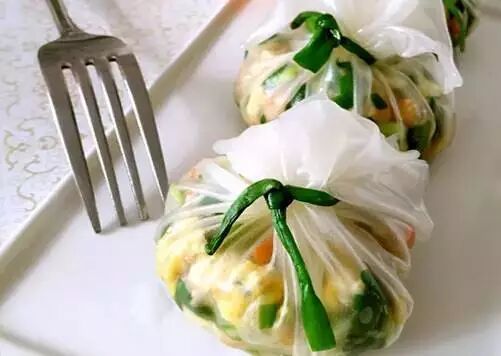 4.水晶皮泡软后,包上做好的馅料,韭菜叶用热水焯软,扎紧包子口即可