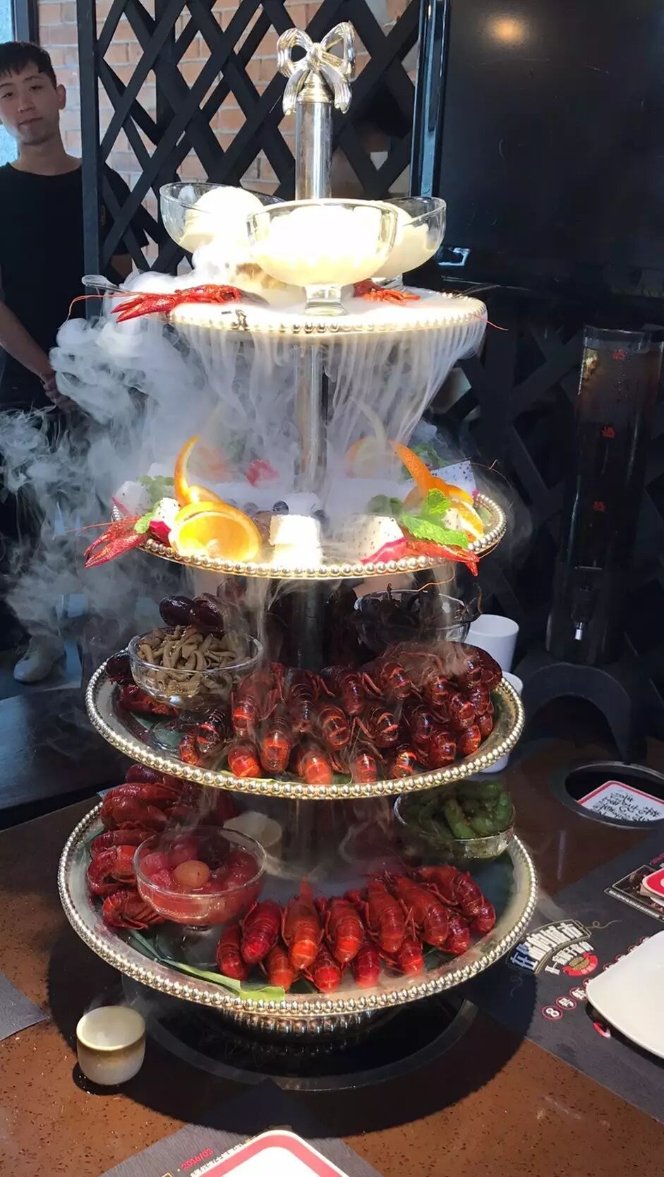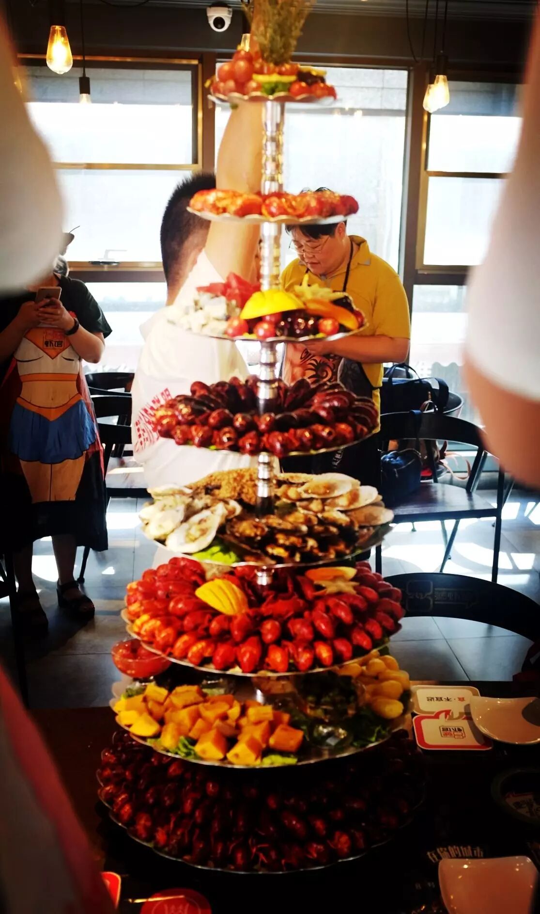 镇店虾塔一共有8层,看看手伸直了才刚到顶,油焖虾、蒸虾、卤虾、芥末虾,加上虾球、扇贝等海鲜拼盘,配上切的整齐的水果,色香味俱全。而芥末虾真的非常赞,吃第一个的时候真心呛到了,有些冲鼻,吃着又刺激又过瘾!