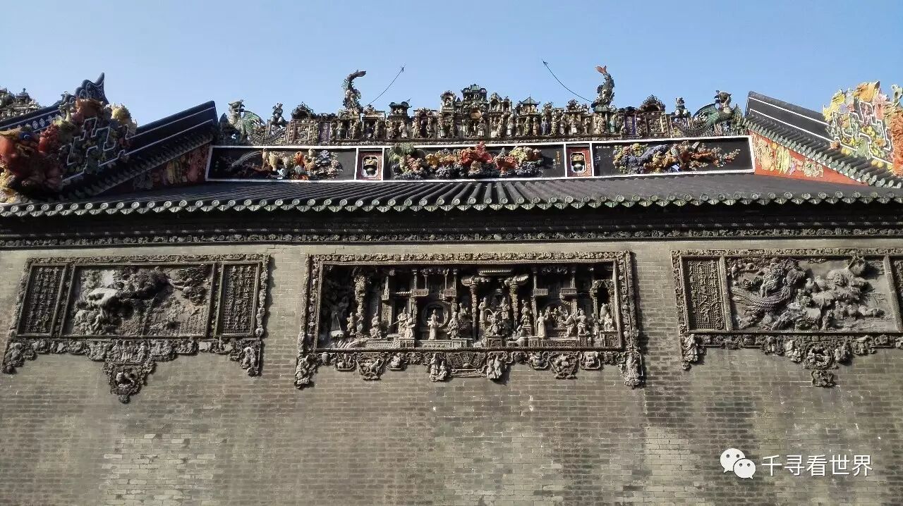 各种彩色雕塑,从屋脊到雨檐,从房梁到廊柱,从窗户,墙面到栏杆再到地面;有砖雕、木雕、石雕等三大传统雕塑,也有岭南特色的陶塑和房脊上琳琅满目的灰塑……一个集大成的雕塑汇。