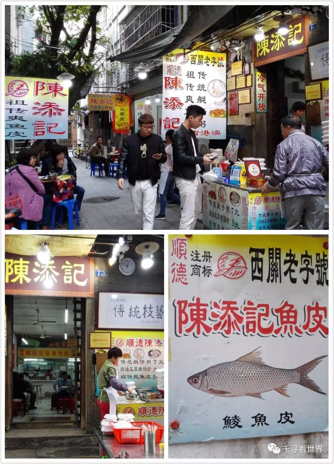 2、陈添记爽鱼皮(荔湾区宝华路59号侧十五甫三巷内进第2档)。只卖三样小吃:祖传爽鱼皮,豉(chǐ)油王蒸猪肠粉和传统艇仔粥。