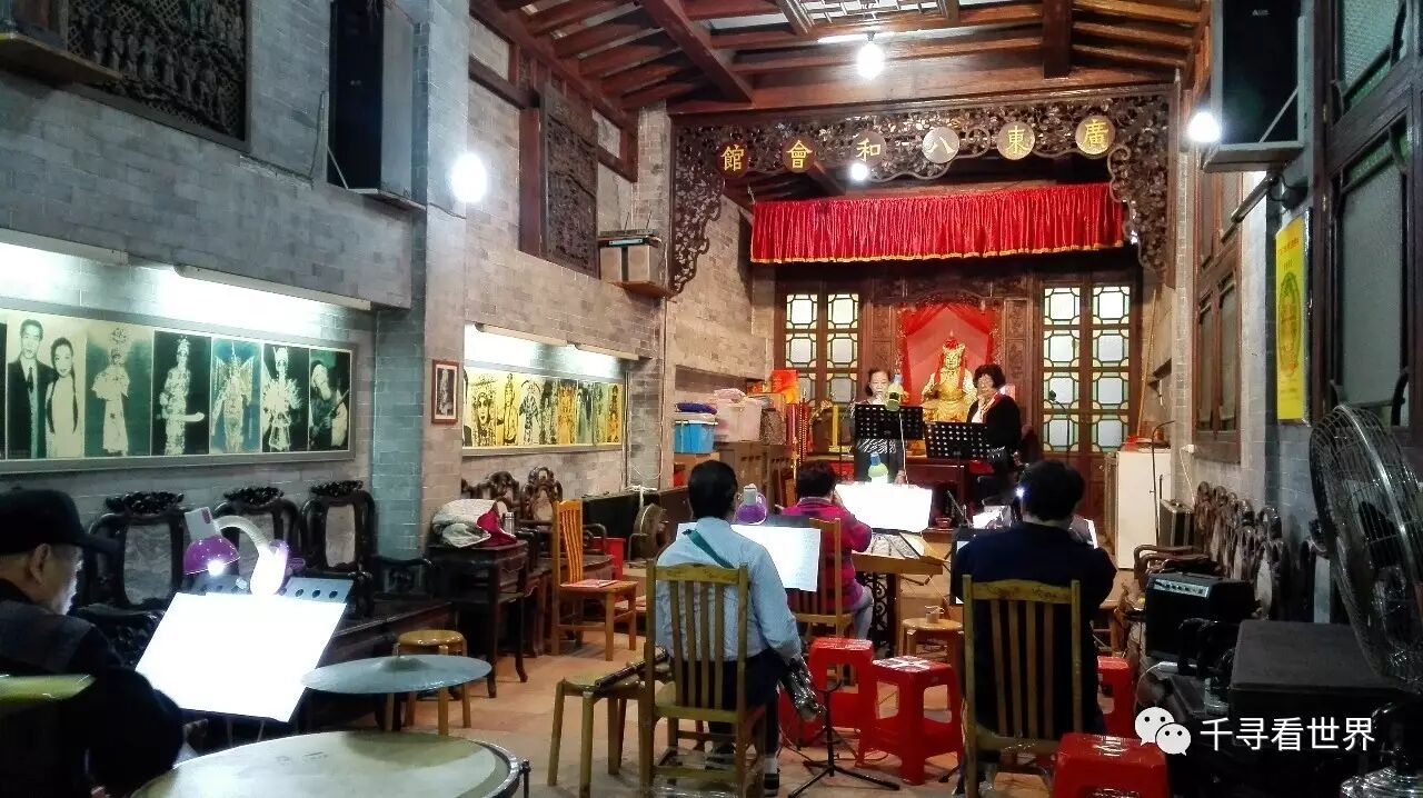 我们那日经过此地,入内参观时,馆内艺人们正在排练。一位老伯用粤语对着我说了半天,没听懂。后来才知道老伯是让我也来这里学唱粤剧小调