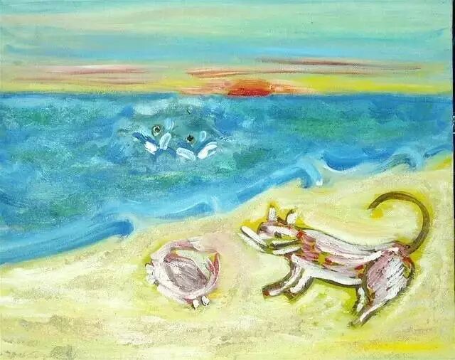 比如你以为那是乌龟?错,那是螃蟹,你以为那是狗?不,那是猫。以及你以为海上是两只海鸥?不,那是两个在呼救的游泳者……画家的意图或许是为了向大家传达:海上有风险,游泳需谨慎!