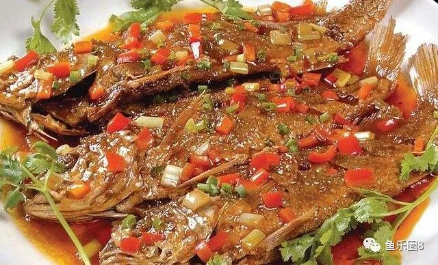 4、将火调回大火,待油温重新升高到八九成热(油里冒泡泡)时,将小黄鱼放进,大火复炸至表面金黄,即可捞出,与椒盐、鸡酱一同上桌。