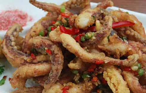 2. 用旺火热炒锅下植物油,七成热时放入鱿鱼炸至外酥脆而内软嫩,倾入漏勺沥油,再放回炒锅内,烹料酒、盐迅速炒匀上盘即可,佐以花椒盐食用。