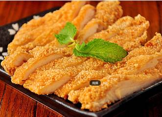 2.将鸡肉裹匀面粉,挂匀鸡蛋黄液,再沾满面包渣按实,放入五成热油中炸呈金黄色时,即可捞出,切成1.5厘米的宽的条,按原形铲入盘内,用生菜围边以增美观。配上椒盐,就可以蘸着吃啦。