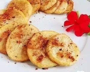 3.待炒锅内油再烧至七成热时放入土豆片复炸,炸至金黄色时捞出沥油后装盘,撒上花椒粉和白砂糖后就可以吃啦。