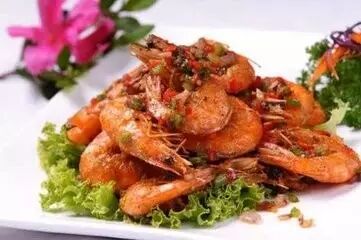 4. 锅内留适量油,放入料头(蒜茸、椒米)、炸熟的鲜虾,下酒,加入椒盐速炒勺即可。