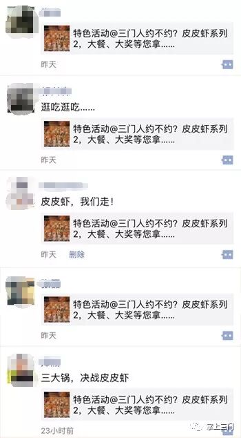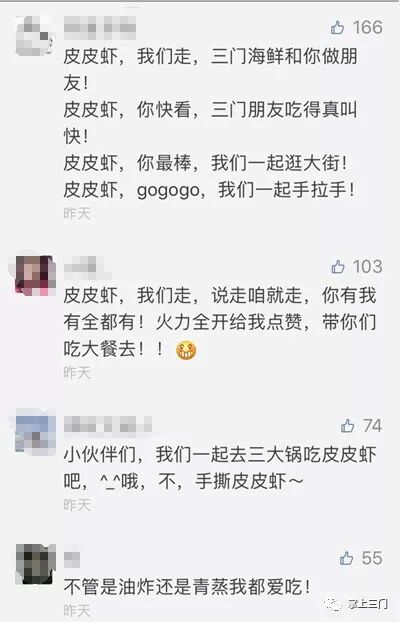 “皮皮虾,我们走,三门海鲜和你做朋友……”,“三门皮皮虾,不火不行啊,就问你:约不约?”,“皮皮虾,快到碗里来”……网友纷纷在后台留言并积极转发朋友圈,邀请好友为自己的留言点赞,让皮皮虾在朋友圈大火了一把。