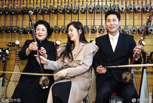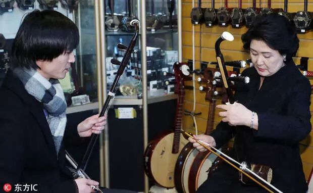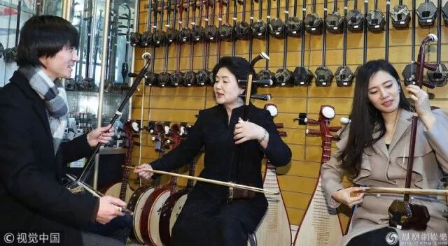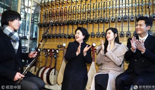 第一夫人金正淑在中韩跨国明星夫妇于晓光和秋瓷炫陪同下,来到了北京的一家二胡店。