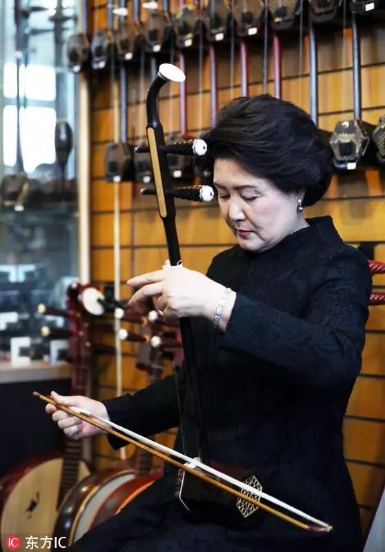 在店里,金正淑体验了中国传统乐器,还兴致勃勃地拉起了二胡。