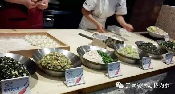 舜和海鲜在明档中专门设计了一个现包水饺档,两个大嫂厨师现做现包,各种馅料摆在顾客面前,家庭包饺子的亲切感扑面而来。还可以现场煮,一边包、一边煮,热气腾腾,跟家里过年似的,顾客一看这热火朝天劲儿,经常是其他菜还没点,就先告诉点菜员:“给我先留两份水饺!”