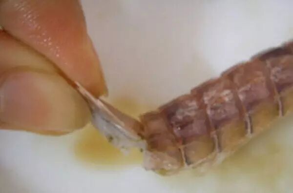 ①把尾部最外面两个小脚拧断,然后捏着尾部轻轻往上一折,再拧掉