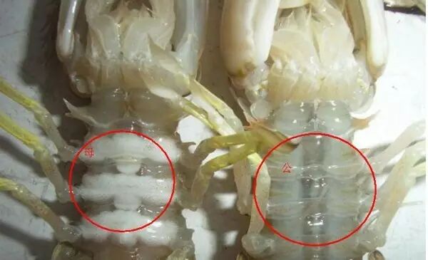 3、看“小腿”。每个皮皮虾颈部都有六条小腿,分两侧各三条,雄性最下面的小腿根部会看到多出两条小腿,雌性则没有。