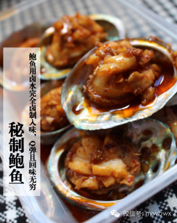 ▲精选八头鲍,经卤啊卤秘制卤水长时间卤制入味后再佐以酱料加工制作,美味有嚼劲。