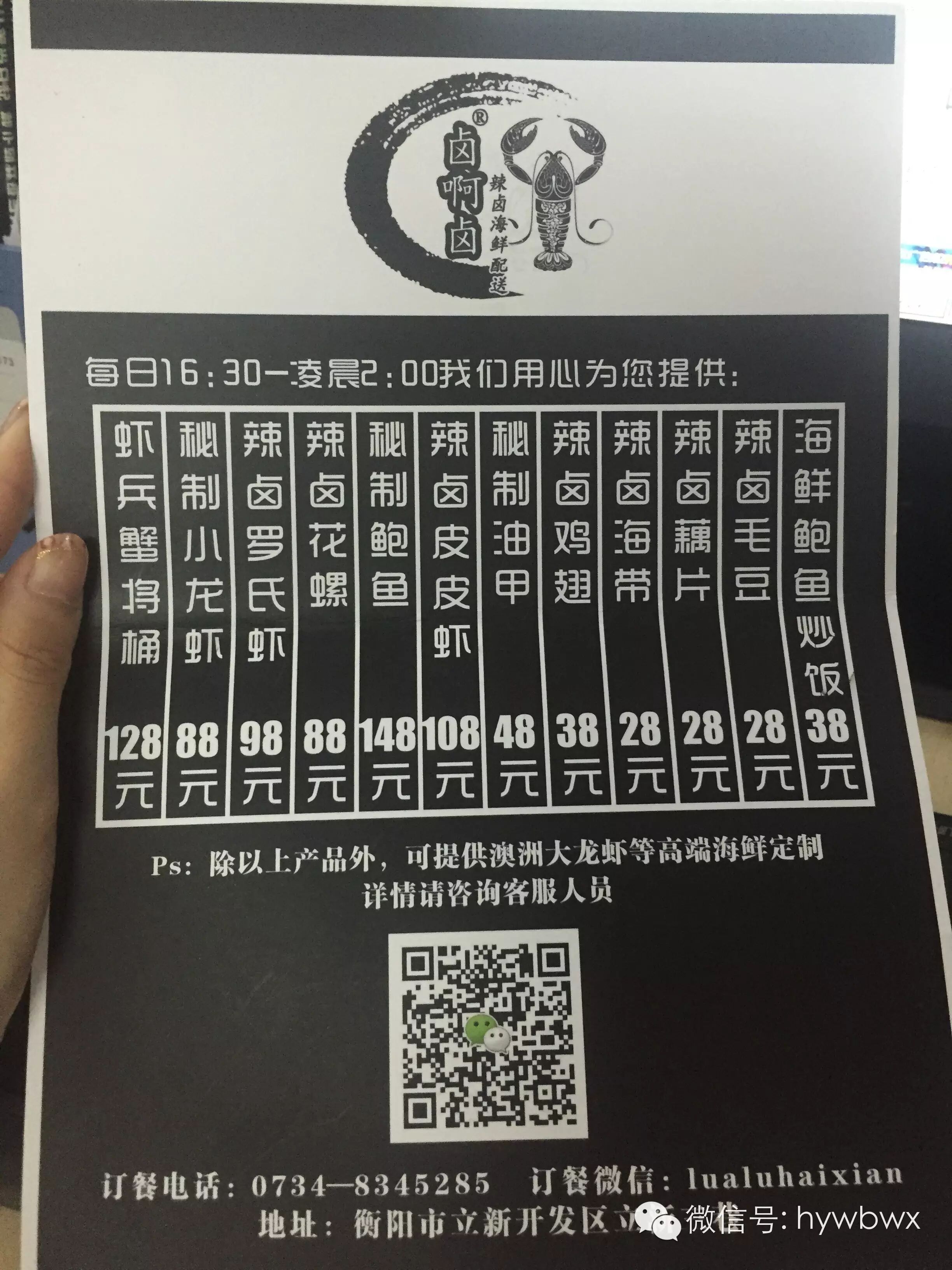 【卤啊卤辣卤海鲜配送中心.微信号:lualuhaixian】于6月1日正式登录衡阳。颠覆传统海鲜吃法,辣与卤的完美结合,采用东南沿海卤味世家三十年珍藏卤药加工制作,给你带来前所未有的饕餮盛宴。