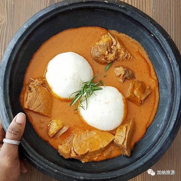 和Banku类似,Fufu也是由木薯、山药和大蕉(?*我们后面会提到这是啥)一类的作物煮熟后揉成团状,有点类似于我们的手工糍粑。但重点在于要配汤或者酱料来食用,味道很特别。