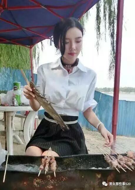 美女给我烤十元钱的羊肉串,一根一根的烤好吧