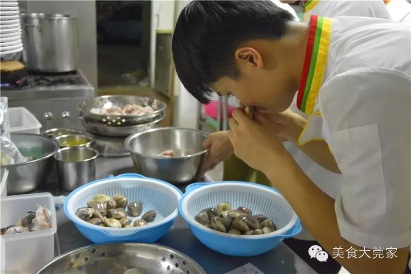 厨房一角的帮厨,在上菜前,将全部贝壳都确定一轮保证新鲜才上菜。
