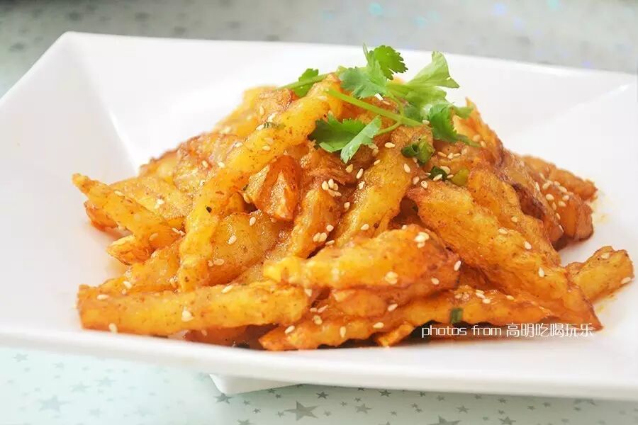 麦当劳薯条你吃得多了,狼牙土豆作为一种小吃在四川一带可比麦当劳畅销得多得多得多了。为啥叫狼牙咧?其实只是用特制道具切成波浪形,外形向而已啦~用七里香香料拌好的炸土豆,营养好,味道香,就连店主的小公举都赞不绝口呢。