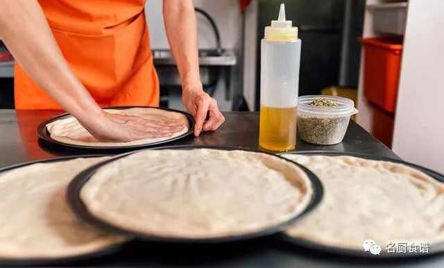 5、取直径20厘米的披萨盘一个,盘底和盘壁刷上橄榄油;