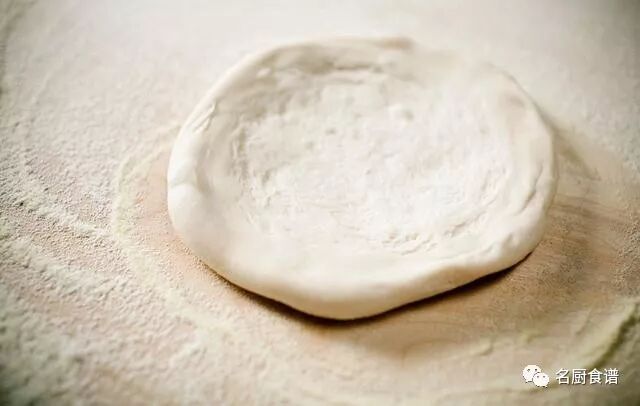7、用手指把当中的面饼往四壁按一按,让面饼四周厚,当中稍薄,用叉子在面饼上戳一些小孔;