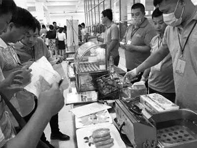 当天上午,记者来到栖霞中学食堂,一、二两层俨然成为菜市场,来自全市以及周边地区的100个通过初审的食材企业和9家送餐企业各展神通,将自己的食材以及招牌菜或者手艺统统搬了出来,不少厨师现场展示,而很多摊位前面都放上了可以免费品尝的食物。