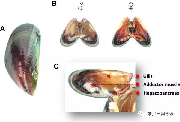 贻贝是雌雄异体,一般可从成熟的生殖腺颜色来鉴别,雄性是黄白色的,而雌性是鲜艳的橙黄色。