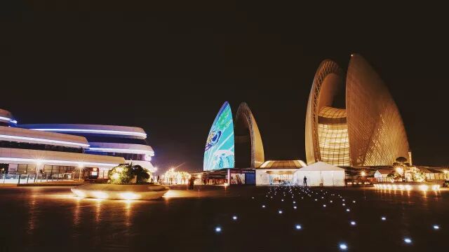 作为中国唯一一座建在海岛上的歌剧院,与一望无际的蓝色海洋和郁郁葱葱的野狸岛交相辉映,洋溢着浓郁的文艺魅力。一到晚上,大剧院两扇贝面上演美轮美奂的幻彩灯光秀,点亮湛蓝夜空下的珠海。