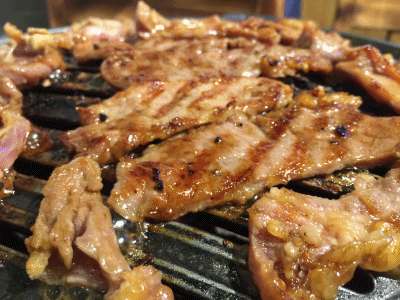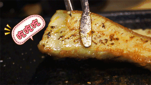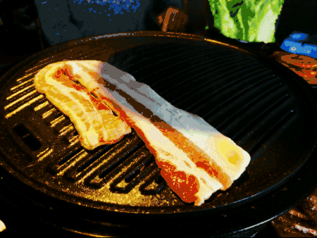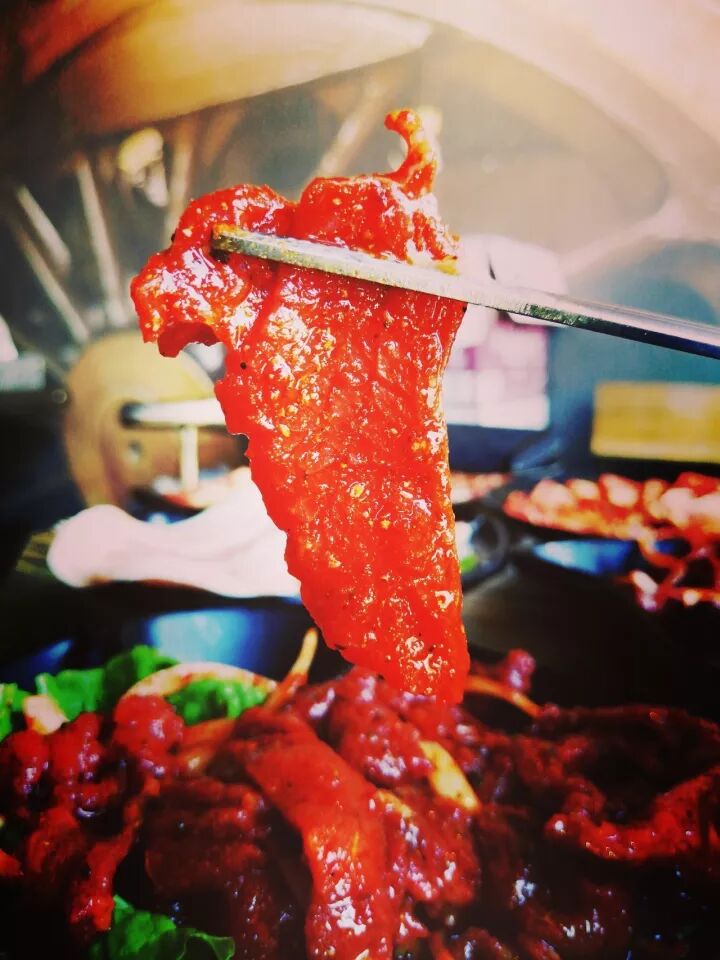 厚切一大片,先整片烤块滋滋冒油,再剪成条状。当然,嗜肉者也可以蘸取味道浓郁的酱料直接吃,烤到焦嫩的五花肉,油脂已所剩无几。