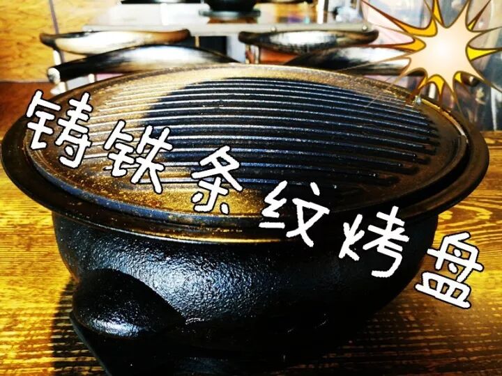 他家的这个条纹式烤盘可以很充分的接触炭火!不易粘锅,均匀导热,少烟,健康环保,吃完不会一身油烟味哦!