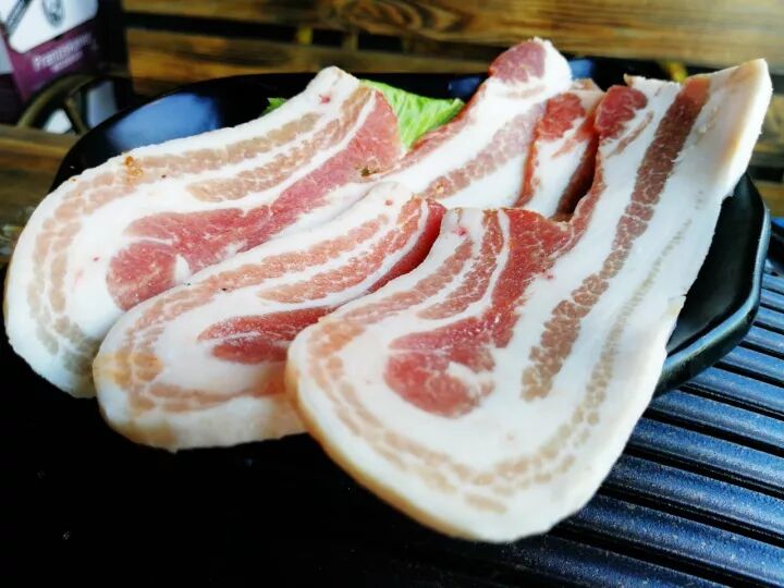 好的五花肉色泽鲜亮,而且微弹。他家的五花肉除了做到这点以外,还专门选取了肥→瘦→肥→瘦的纹路。