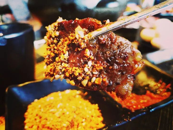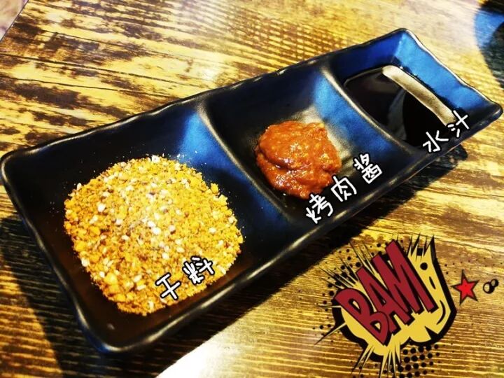店里有三种调料可供选择,烤肉酱适合高油脂的五花肉,水汁则适合牛排,雪花,干料就蘸蘸低油脂的牛羊就好啦~