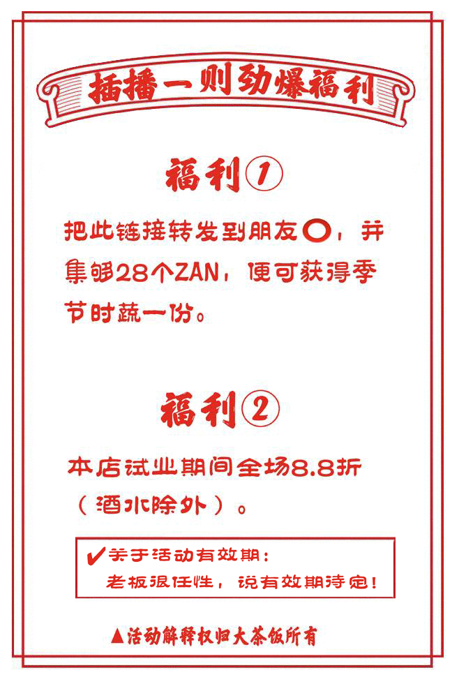 营业时间:下午5点-次日凌晨4点(即晚饭:下午5点-次日凌晨4点;宵夜试业期间:晚上10:30-次日凌晨4点)