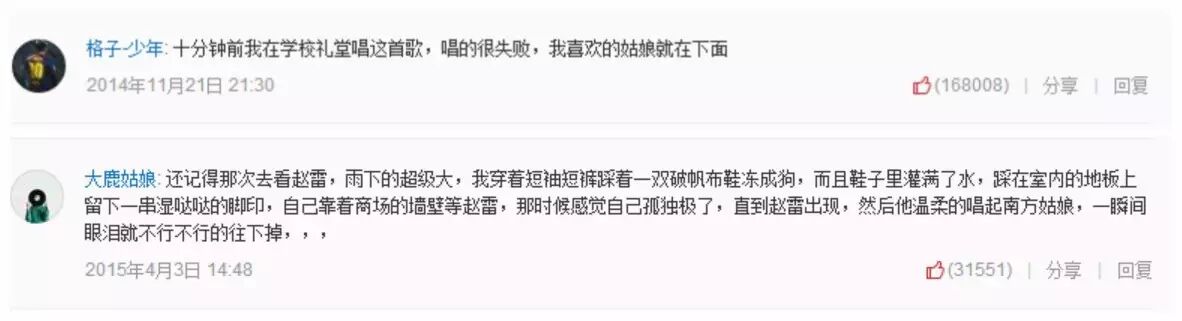网易云音乐里,《成都》的下面有这样一条评论:你真的红了,很开心,内场票也能卖到1000+。虽然以前50块钱就能听你的livehouse,越来越听不起你的演唱会,不过没关系,我会努力变得跟你一样好。民谣不应该穷,以前你吃过的苦都是值得的,难过的日子都是你陪我一起过的。你说你是个普通人,想要买房结婚,我知道,愿你有酒有肉有姑娘。赵雷。